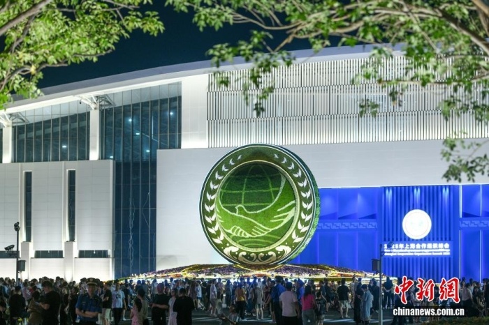 主题的花床在“ 2025上海合作组织峰会”区域外。中国新闻服务记者Tong Yu摄